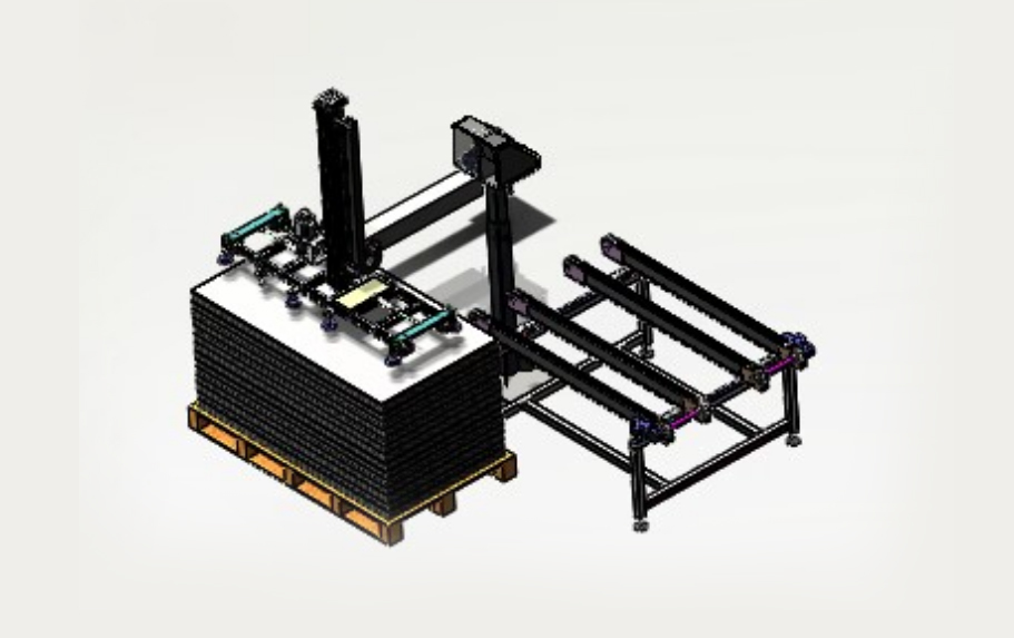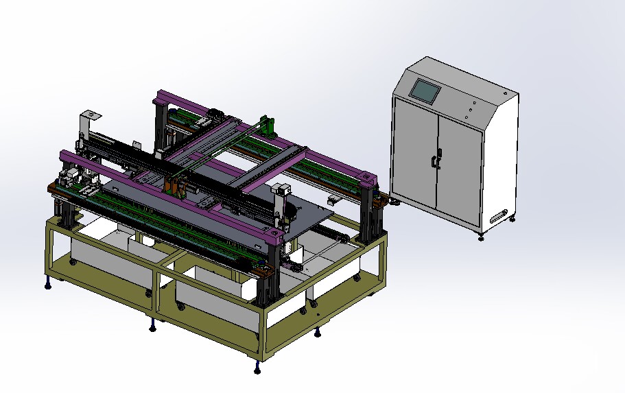 自動(dòng)排版機(jī)的主要功能單元有:玻璃輸送定位系統(tǒng)、抓取行走系統(tǒng)、視覺(jué)檢測(cè)系統(tǒng)、電控系統(tǒng)等;通過(guò)以上功能單元,實(shí)現(xiàn)了將自動(dòng)串焊機(jī)串焊好的電池串,按照工藝尺寸要求和排版方向順序自動(dòng)排版鋪設(shè)到玻璃(EVA已經(jīng)鋪設(shè))上,組成電池串陣列。玻璃/EVA通過(guò)傳輸線(xiàn)傳輸至指定位置,機(jī)械手抓取電池串實(shí)現(xiàn)CCD定位、自動(dòng)旋轉(zhuǎn)、自動(dòng)排版功能。設(shè)備通過(guò)同步帶傳輸與自動(dòng)生產(chǎn)線(xiàn)對(duì)接,實(shí)現(xiàn)了自動(dòng)流水作業(yè)。